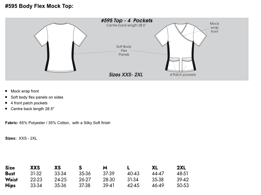 #595 Body Flex Mock Top: Mock wrap front Soft body flex panels on sides 4 front patch pockets Centre back length 28.5" Fabric: 65% Polyester / 35% Cotton,  with a Silky Soft finish Sizes:  XXS - 2XL